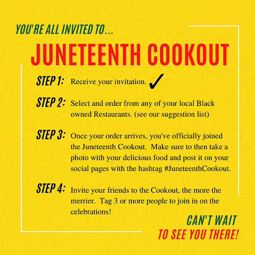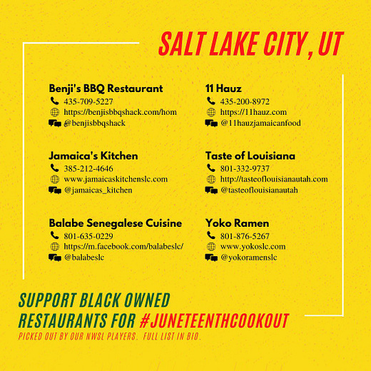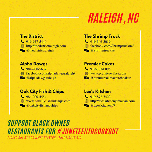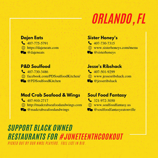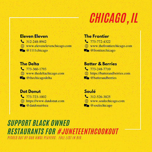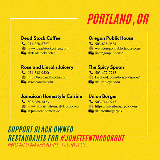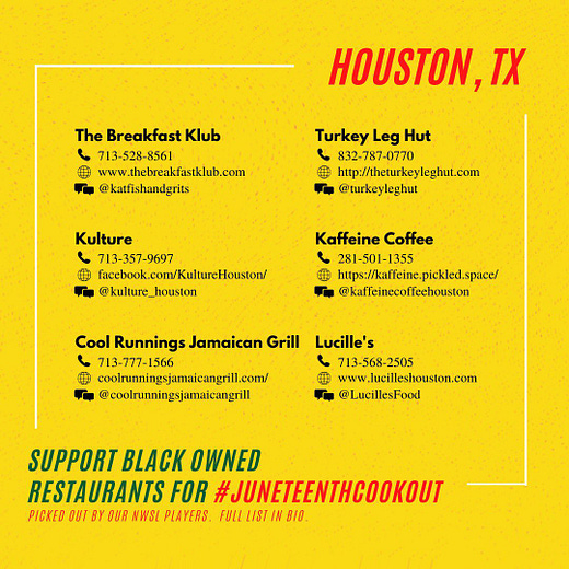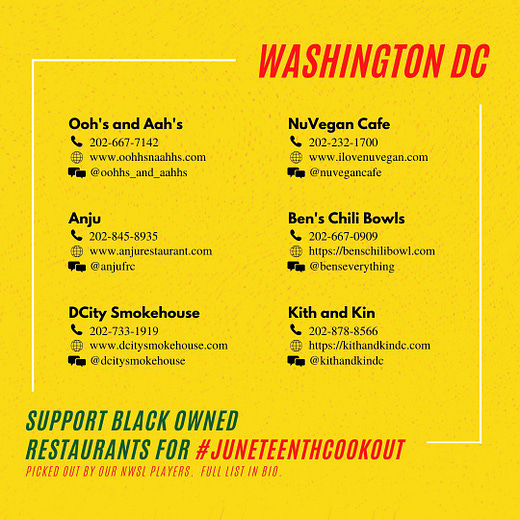 I love this so much. The NWSL Players Association is urging everyone to order from local Black owned restaurants today, and join the virtual #JuneteenthCookout by posting your meal on social media and encouraging your friends to join.