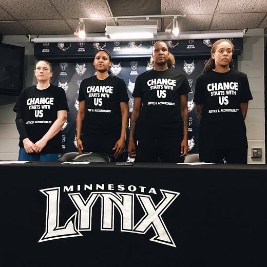 The moment quickly became about much more than just the Lynx. That season, six WNBA teams wore Black Lives Matter t-shirts; four teams holding media blackouts, where they refused to talk to the media about anything other than systemic racism and police brutality; and three teams knelt during the national anthem in the playoffs.